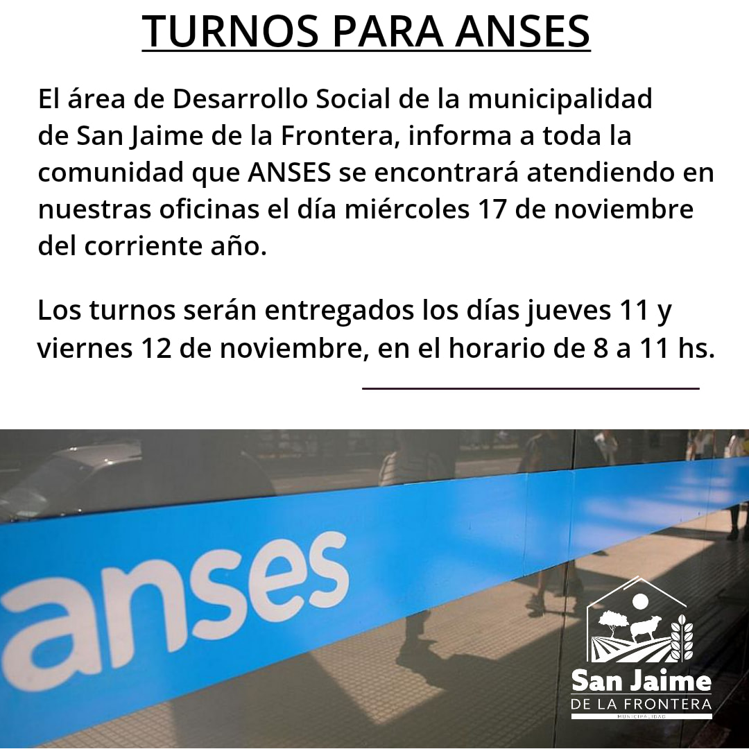 9 noviembre, 2021 - En Noticias Por Prensa Municipal Comentarios Apagados TURNOS ANSES Prensa Municipal prensa@sanjaime.gob.ar Previo RECONOCIMIENTO AL SOCIO FUNDADOR DEL CLUB FRONTERA Siguiente REPROGRAMACION RECOLECCIÓN DE RESIDUOS