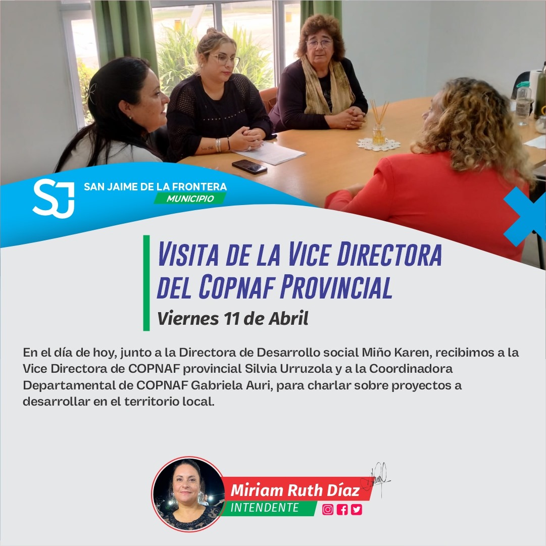 11 abril, 2025 - En Destacadas‚ Gestión‚ Gobierno Por Prensa Municipal Comentarios Apagados VISITA VICE-DIRECTORA COPNAF Prensa Municipal prensa@sanjaime.gob.ar Previo VISITA MINISTRA DESARROLLO HUMANO Siguiente RECEPCIÓN DE APORTES DE ELEMENTOS PEDAGÓGICOS